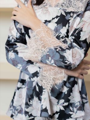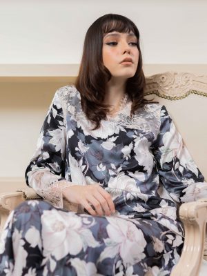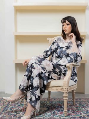 A timelessly Kedah with V neck with pastel pink lace to compliment the printed black color. Made of delicate sateen, this loose top features a loose cutting, and a see-through lace. Comes with a mermaid skirt.