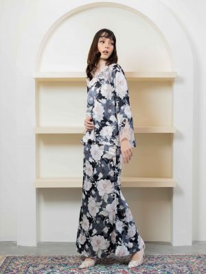 A timelessly Kedah with V neck with pastel pink lace to compliment the printed black color. Made of delicate sateen, this loose top features a loose cutting, and a see-through lace. Comes with a mermaid skirt.