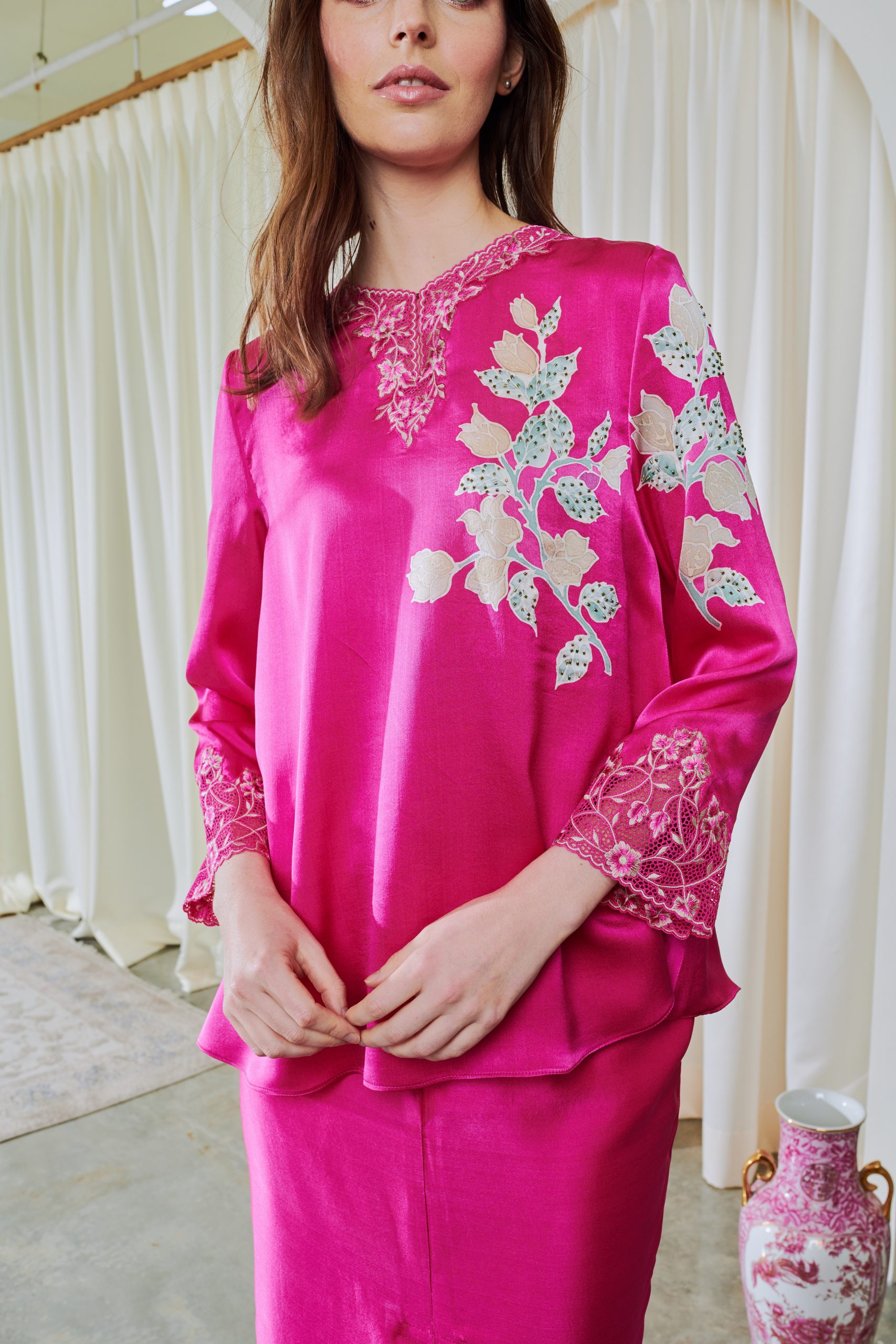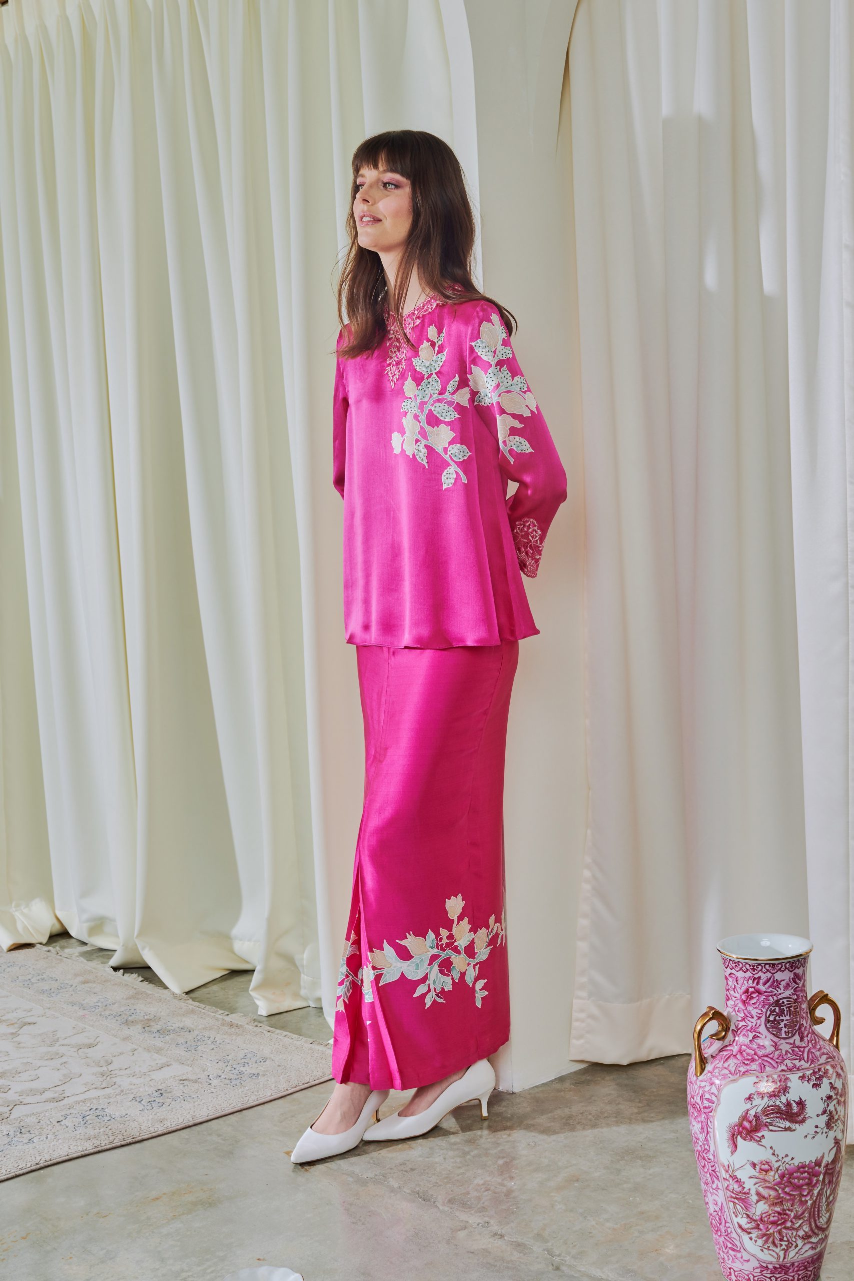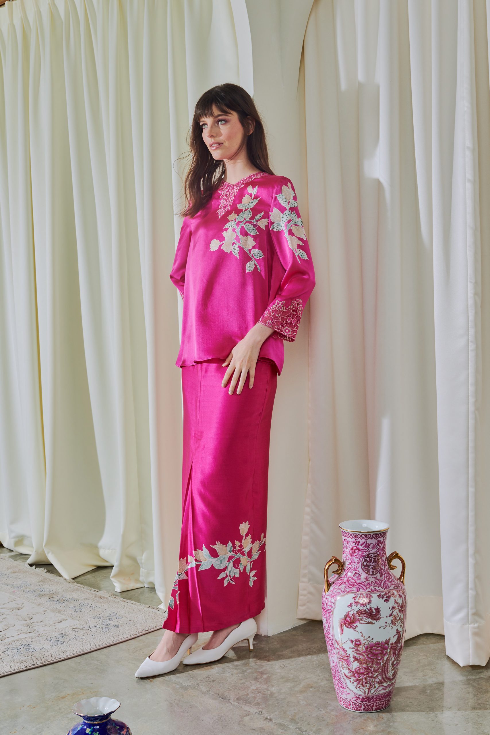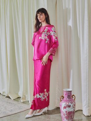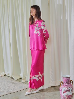 Details: Loose traditional Kedah top paired with Front Pleated skirt. 100% Silk. Hand-painted silk and Sulam Goyang.