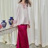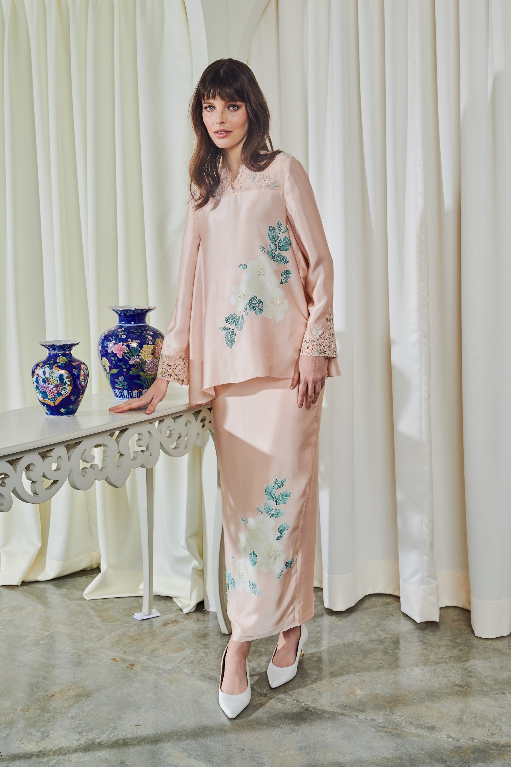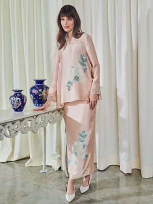 Details: Loose Modern Kedah top paired with Back Pleated skirt. 100% Silk. Hand-painted silk and Sulam Goyang. Beaded French Lace on the chest area.