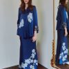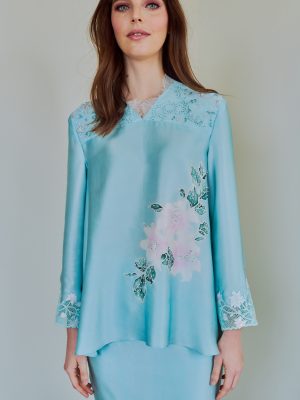 Details: Loose Modern Kedah top paired with Back Pleated skirt. 100% Silk. Hand-painted silk and Sulam Goyang. Beaded French Lace on the chest area.