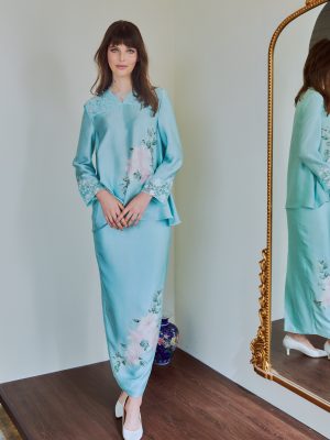 Details: Loose Modern Kedah top paired with Back Pleated skirt. 100% Silk. Hand-painted silk and Sulam Goyang. Beaded French Lace on the chest area.