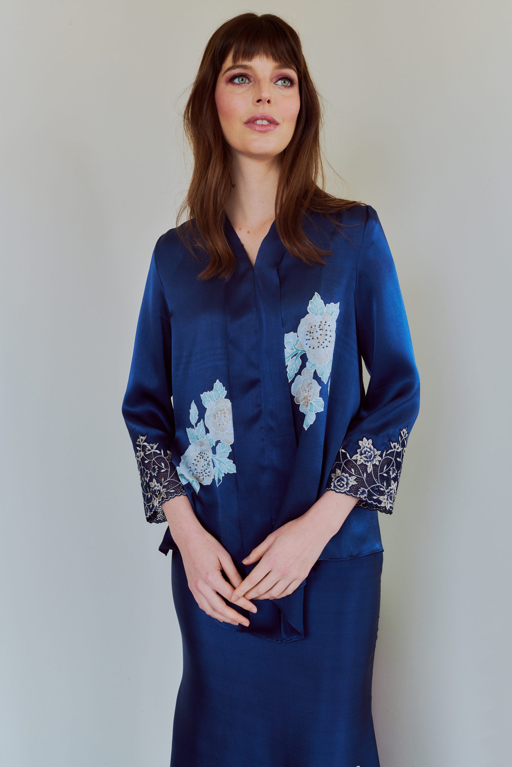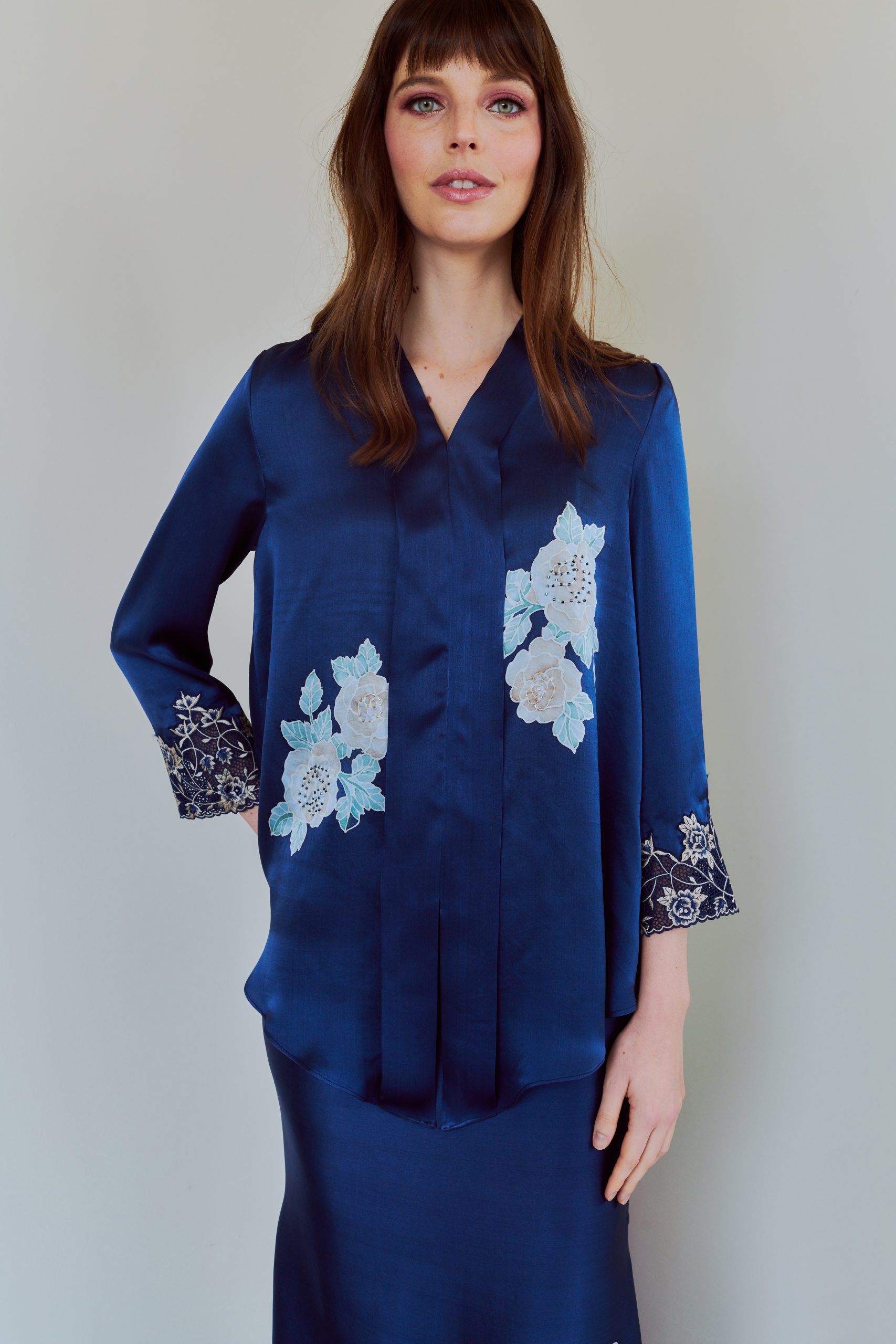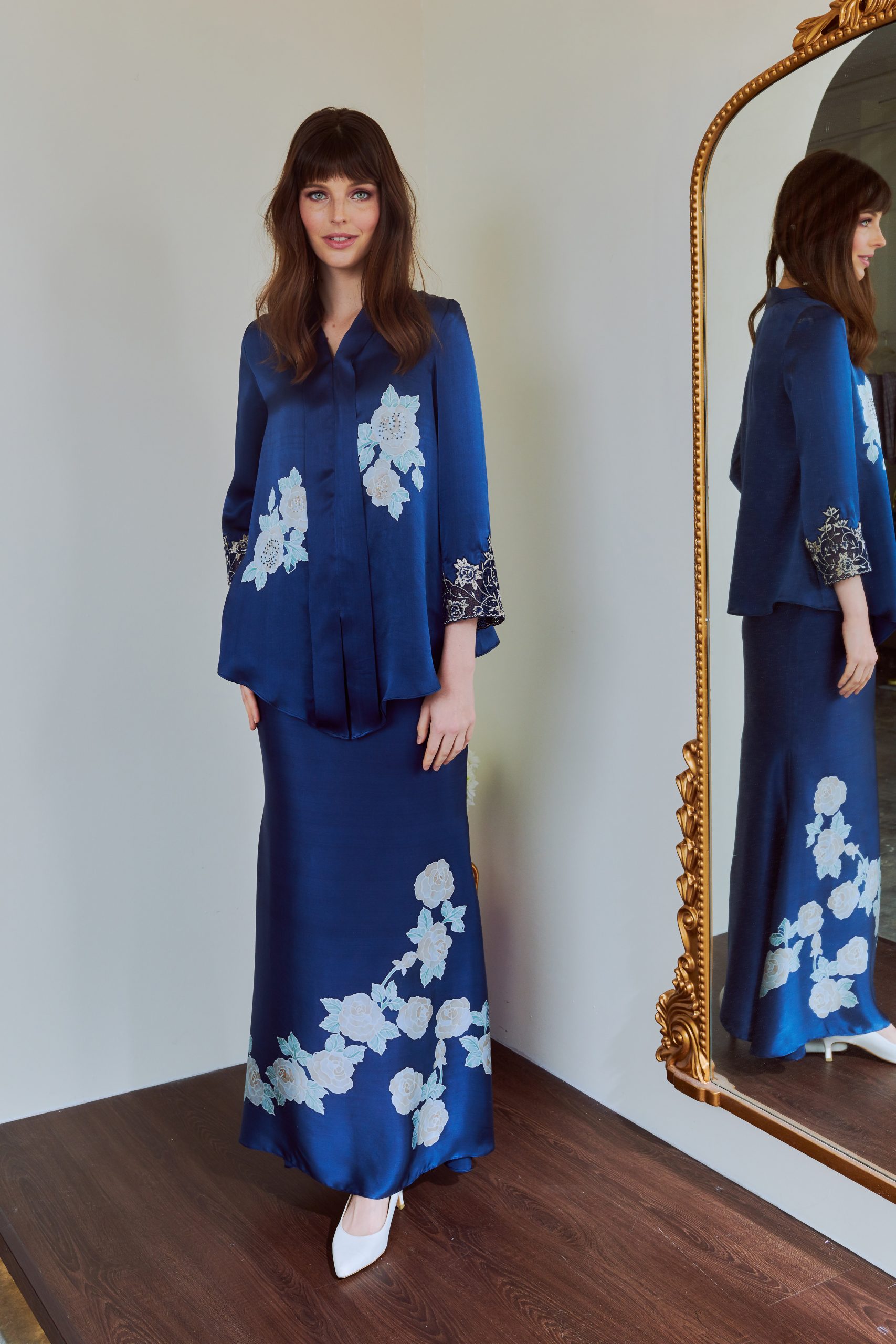 Details: Loose Kebaya top paired with mermaid skirt. 100% Silk. Hand-painted silk and Sulam Goyang. Care Instructions: Dry Cleaning only
