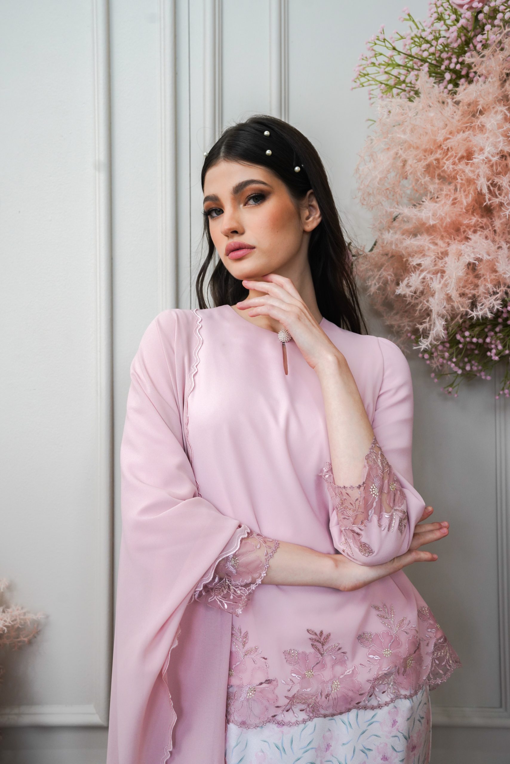 Floral Sulam detailing on sleeves and hem top.