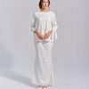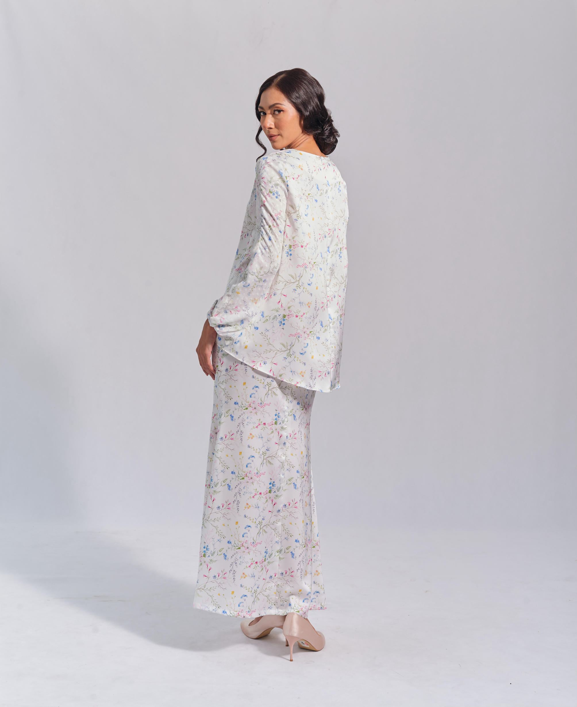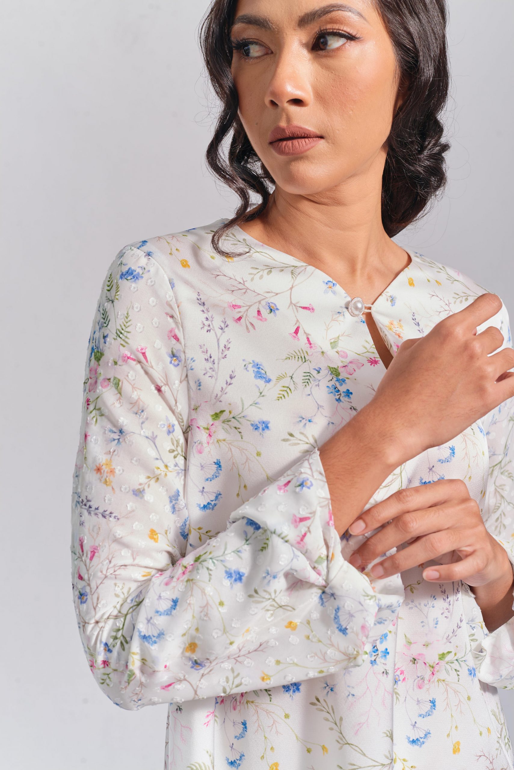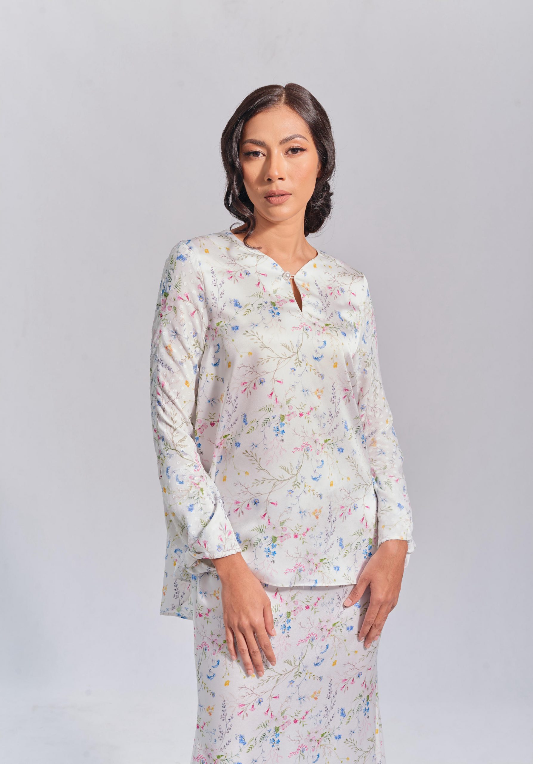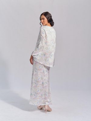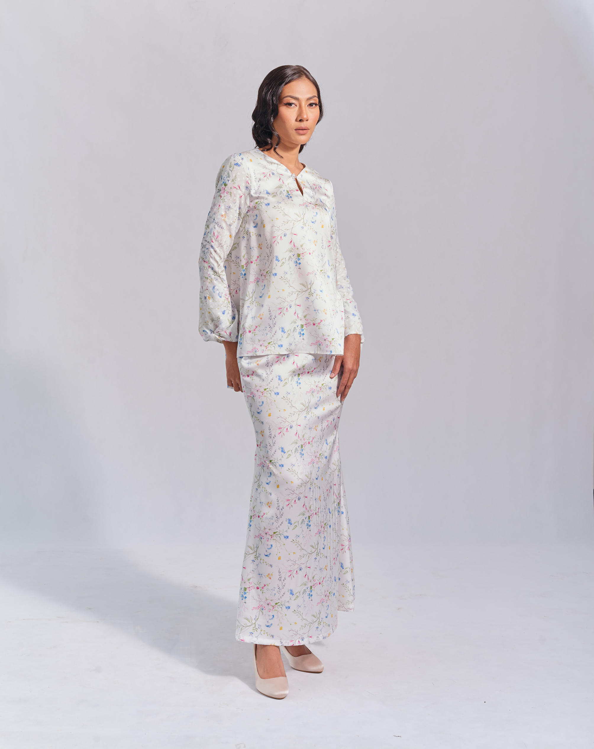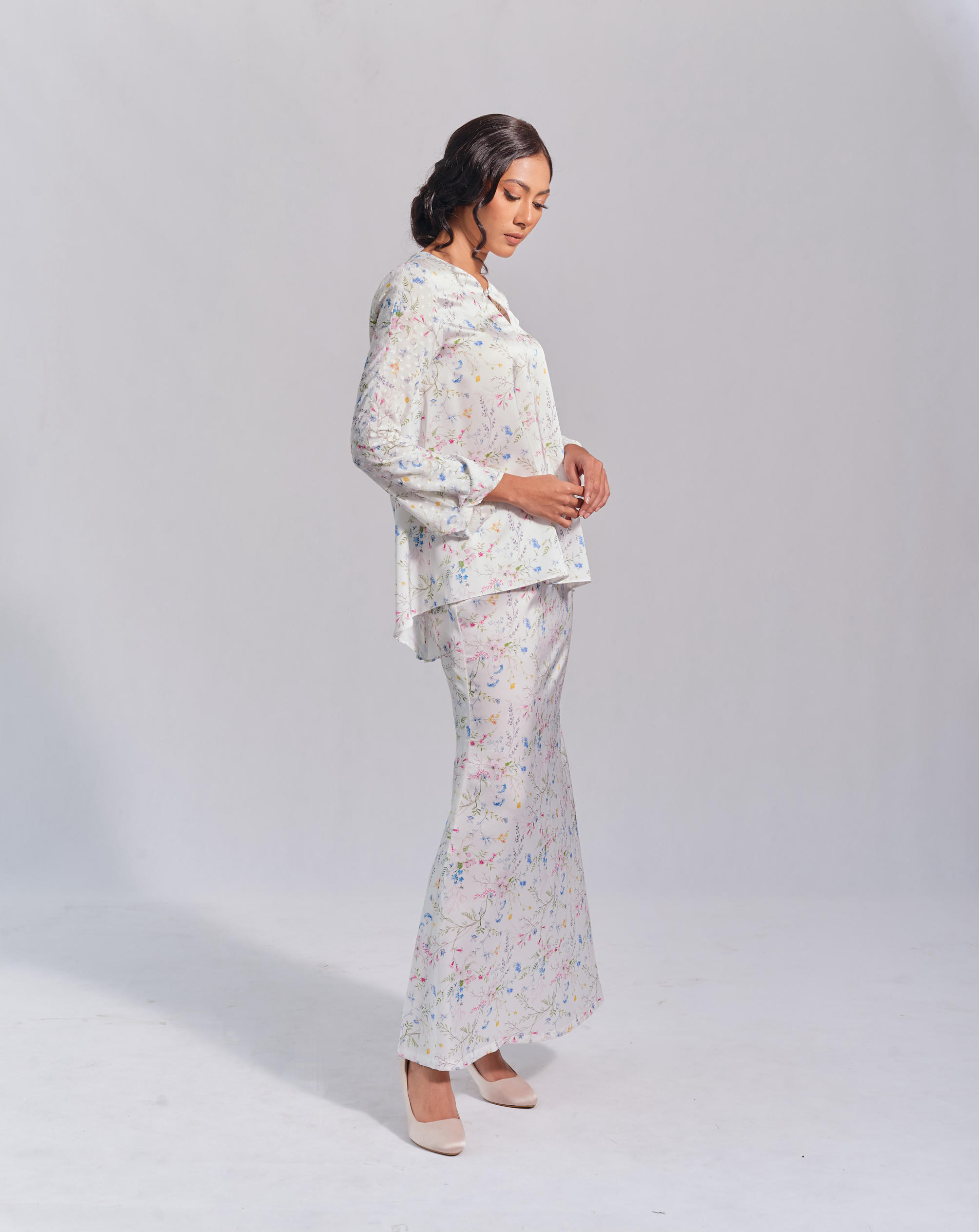 Off-white sateen fabric, with polka dot chiffon sleeves, and mermaid skirt. Fully lining skirt