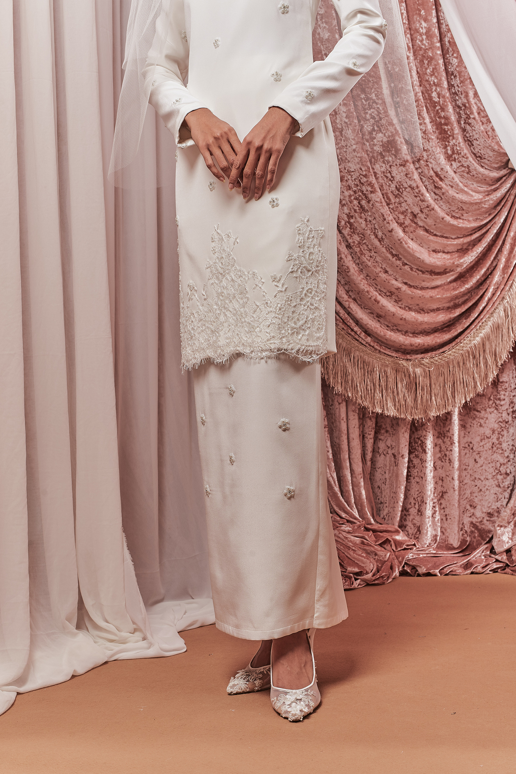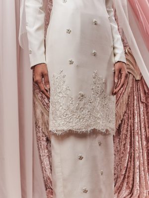 Eye catching feature of Kurung modern with demi-couture beading on the shoulder panel, or the elegantly classic custom bunga tabur. Its a tie – or maybe, the perfect marriage of two equally intriguing details.