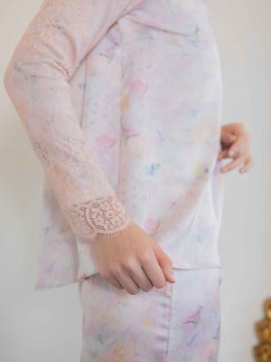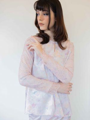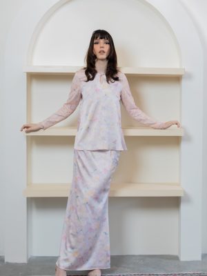 A timelessly Kedah with reglan dusty pink lace on its sleeves. Made of delicate sateen, this top features a loose cutting , a pearls detailing on its neck area. Comes with a mermaid skirt.