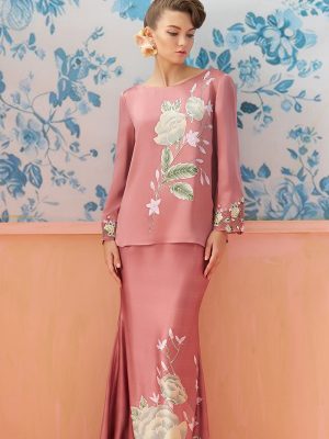 Carefully curated batik on satin silk with the delicate sulam goyang detailing .