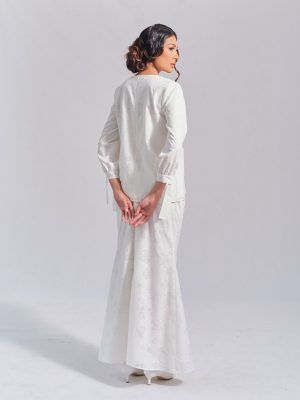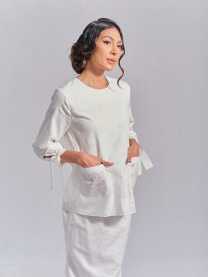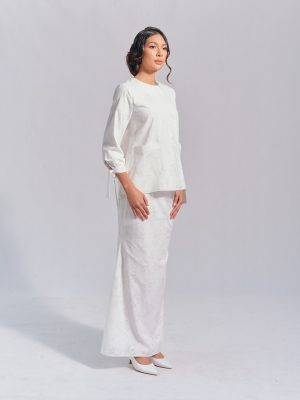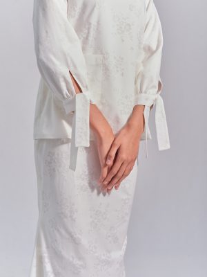 Signature kurung Kedah fully lining in off-white. Top has two front pockets. Mermaid skirt.