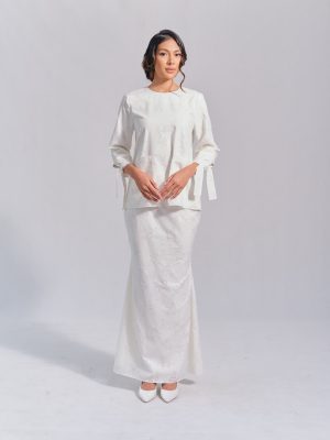 Signature kurung Kedah fully lining in off-white. Top has two front pockets. Mermaid skirt.