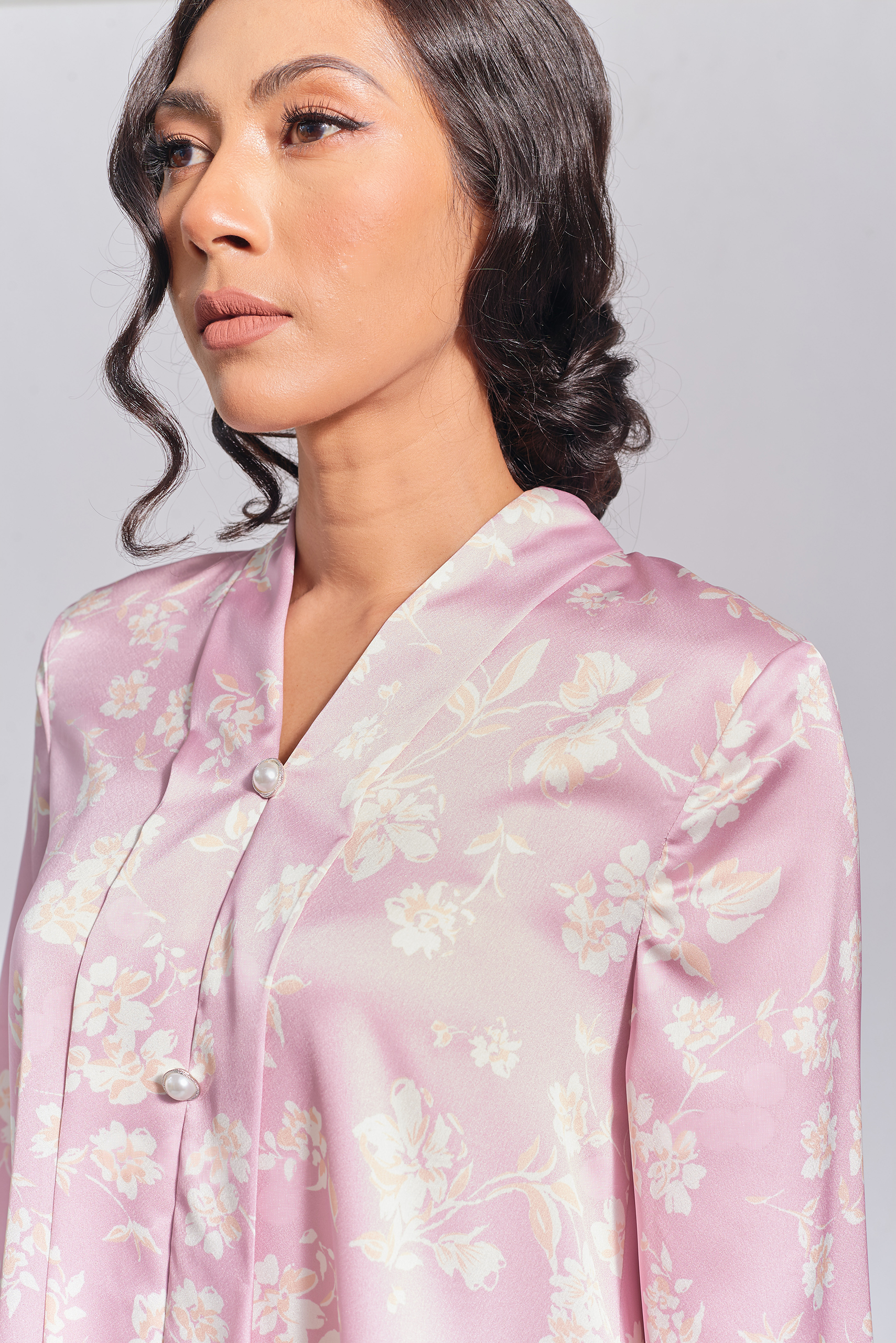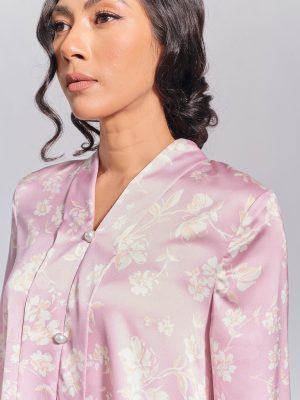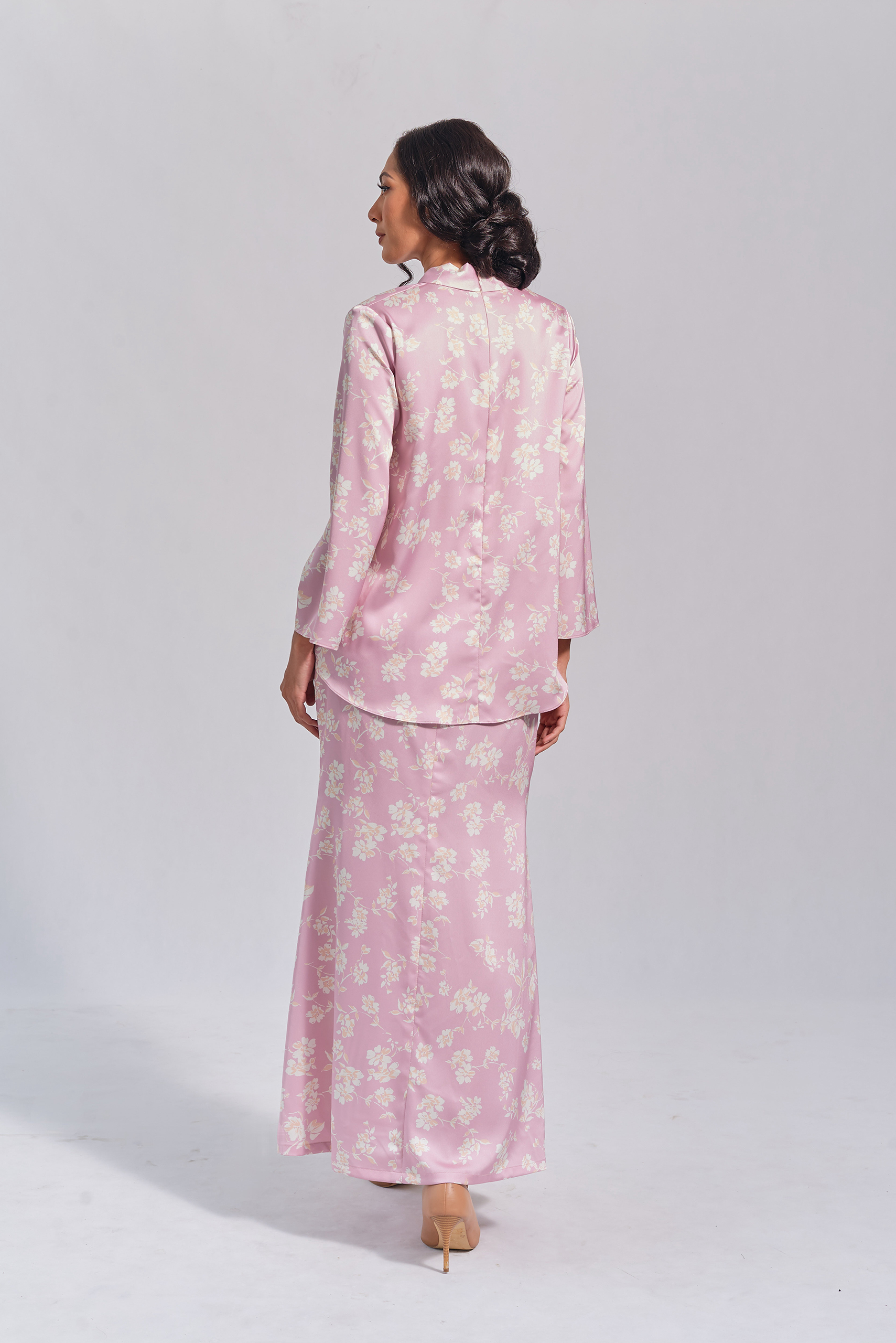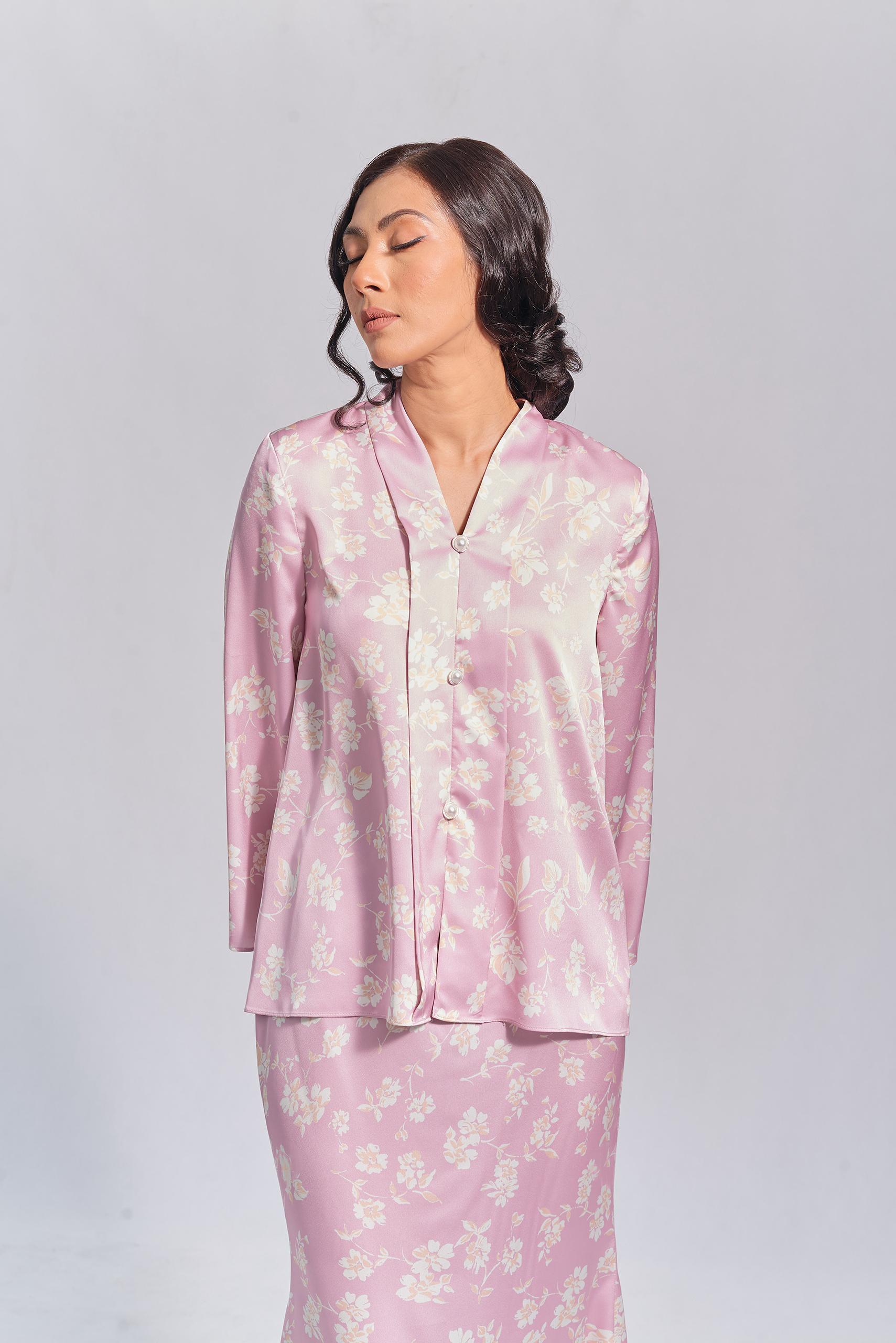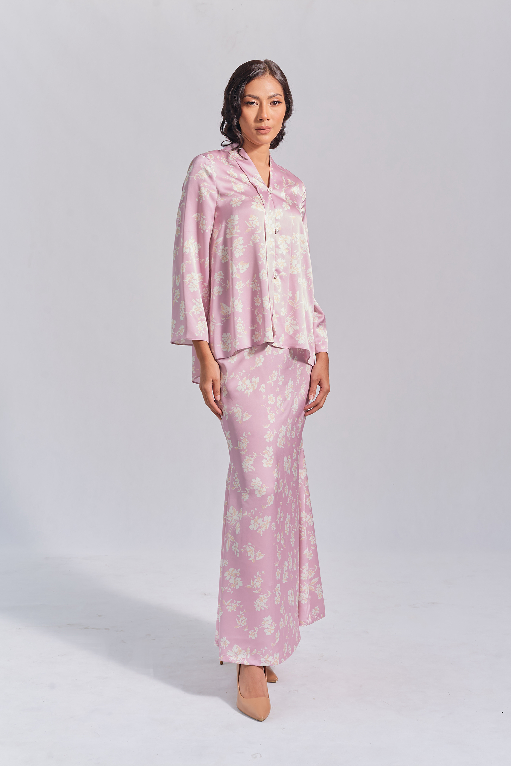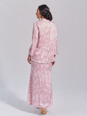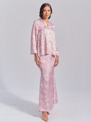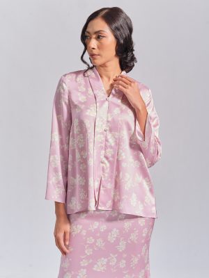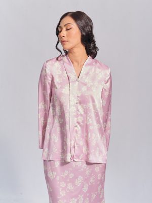Kebaya in lilac colour. The top has 3 non-functional buttons in the front and a zipper on the back. Mermaid skirt.